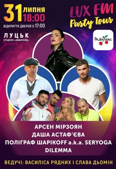Луцк встречай - «LUX FM Party Tour» на стадионе «Авангард» уже 31 июля в 18:00. Вас ожидает самая большая фан и фуд зона, 100500 киловатт звука, огромное количество розыгрышей, выступления топовых звезд украинского шоу бизнеса: - «Стальной» голос страны Арсен Мирзоян. - Истинный ПОЛИГРАФ ШАРИКOFF aka SERYOGA. - Очаровательная Даша Астафьева. - Мегазажигательные DILEMMA - Ведущие события Василиса рядный и СЛАВА Демин - голоса которых Вы можете слышать каждый день на «Люкс ФМ». Спешите, билеты на фан-зону будут расти. Вы просто не имеете права пропустить это событие !!! и не говорите что мы не предупреждали. С Вас - присутствие, с нас - крутой позитивный настрой, лучшая и самая популярная музыка, фудкорт, подарки и много других приятных сюрпризов.