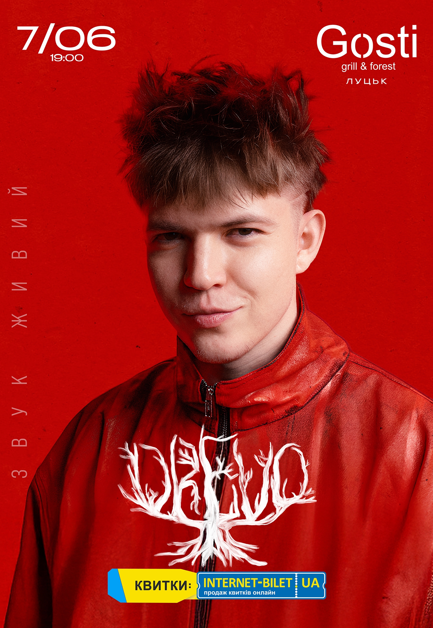 DREVO відбудеться 7 червня 2026, 19:00, неділя в Заміський комплекс «Gosti». За допомогою сервісу internet-bilet.ua, Ви зможете з легкістю забронювати, замовити та купити квитки на концерт, спектакль, оперу, балет, майстер-класи, спортивні та дитячі заходи, що Вас цікавлять, оплативши їх найбільш зручним для Вас способом: через інтернет банківською карткою VISA/MasterCard, готівкою або кур'єром, якщо зробите замовлення квитка з доставкою.