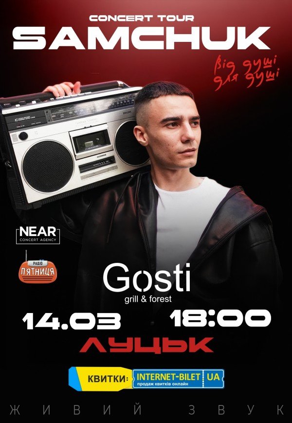 Samchuk відбудеться 14 березня 2026, 18:00, субота в Заміський комплекс «Gosti». За допомогою сервісу internet-bilet.ua, Ви зможете з легкістю забронювати, замовити та купити квитки на концерт, спектакль, оперу, балет, майстер-класи, спортивні та дитячі заходи, що Вас цікавлять, оплативши їх найбільш зручним для Вас способом: через інтернет банківською карткою VISA/MasterCard, готівкою або кур'єром, якщо зробите замовлення квитка з доставкою.