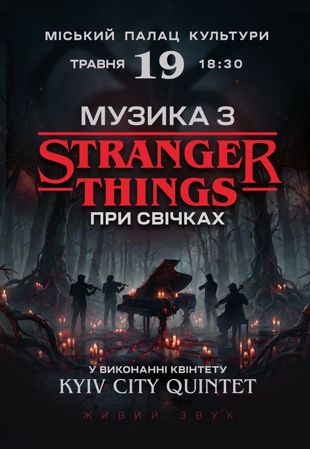 Музика з Stranger Things при свічках відбудеться 19 травня 2026, 18:30, вівторок в Палац культури. За допомогою сервісу internet-bilet.ua, Ви зможете з легкістю забронювати, замовити та купити квитки на концерт, спектакль, оперу, балет, майстер-класи, спортивні та дитячі заходи, що Вас цікавлять, оплативши їх найбільш зручним для Вас способом: через інтернет банківською карткою VISA/MasterCard, готівкою або кур'єром, якщо зробите замовлення квитка з доставкою.